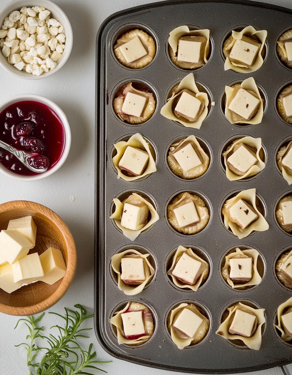 - Assemble the Bites: Place a square of dough in each muffin cup, pressing into the bottom and up the sides slightly to form a cup. Then, insert a piece of brie into each cup. Spoon a small amount of the cranberry mixture on top of the brie. If using, sprinkle some chopped nuts over the cranberry layer.