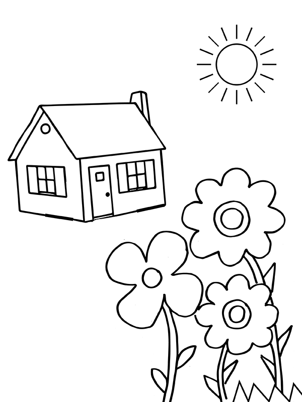 Imagine a cozy little wooden house reaching towards the sun and a few vibrant flowers gracefully growing nearby with grass. It's the complete result of your wish! Now, all you need is the magic touch of colors to make this scene come alive.